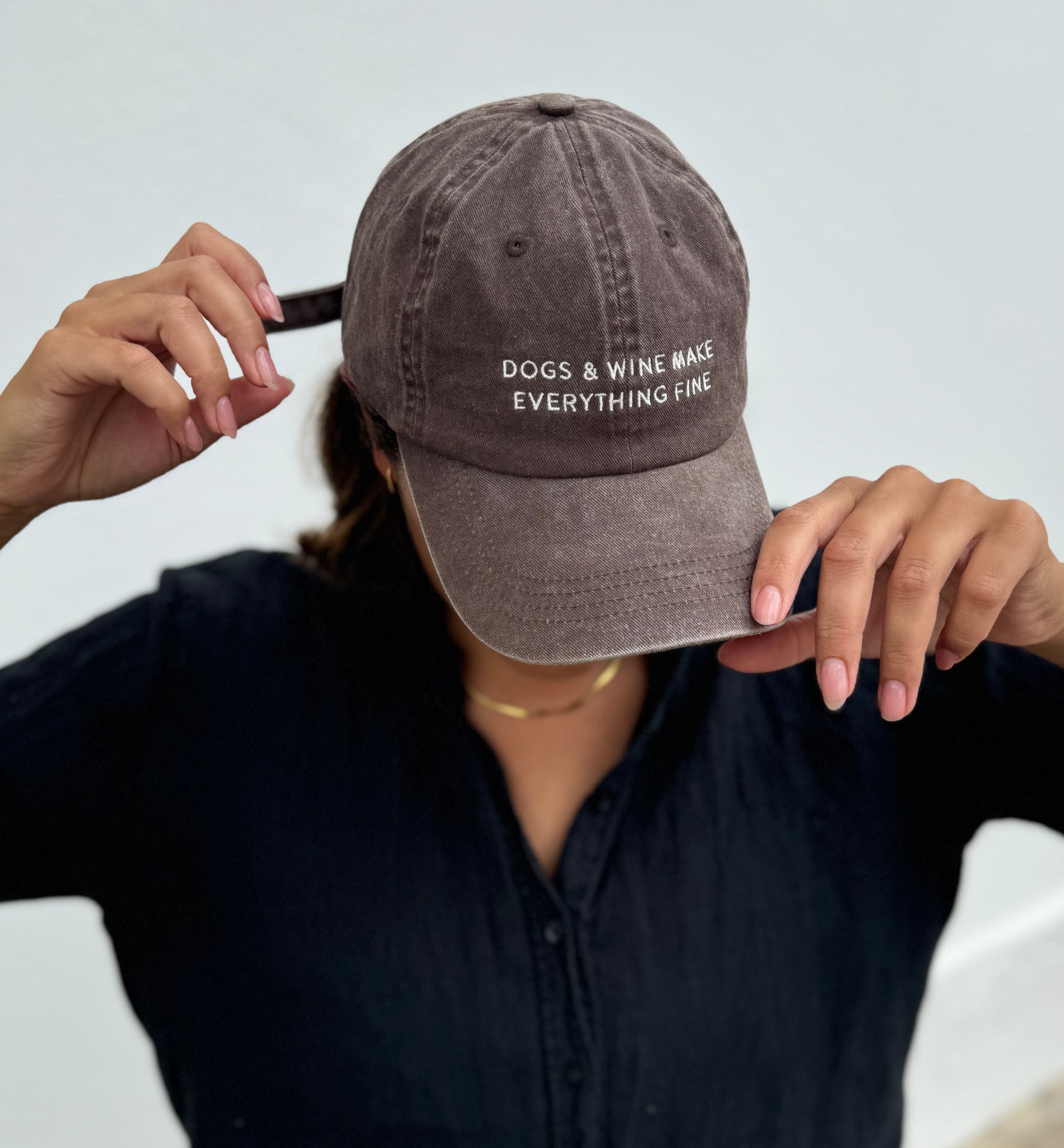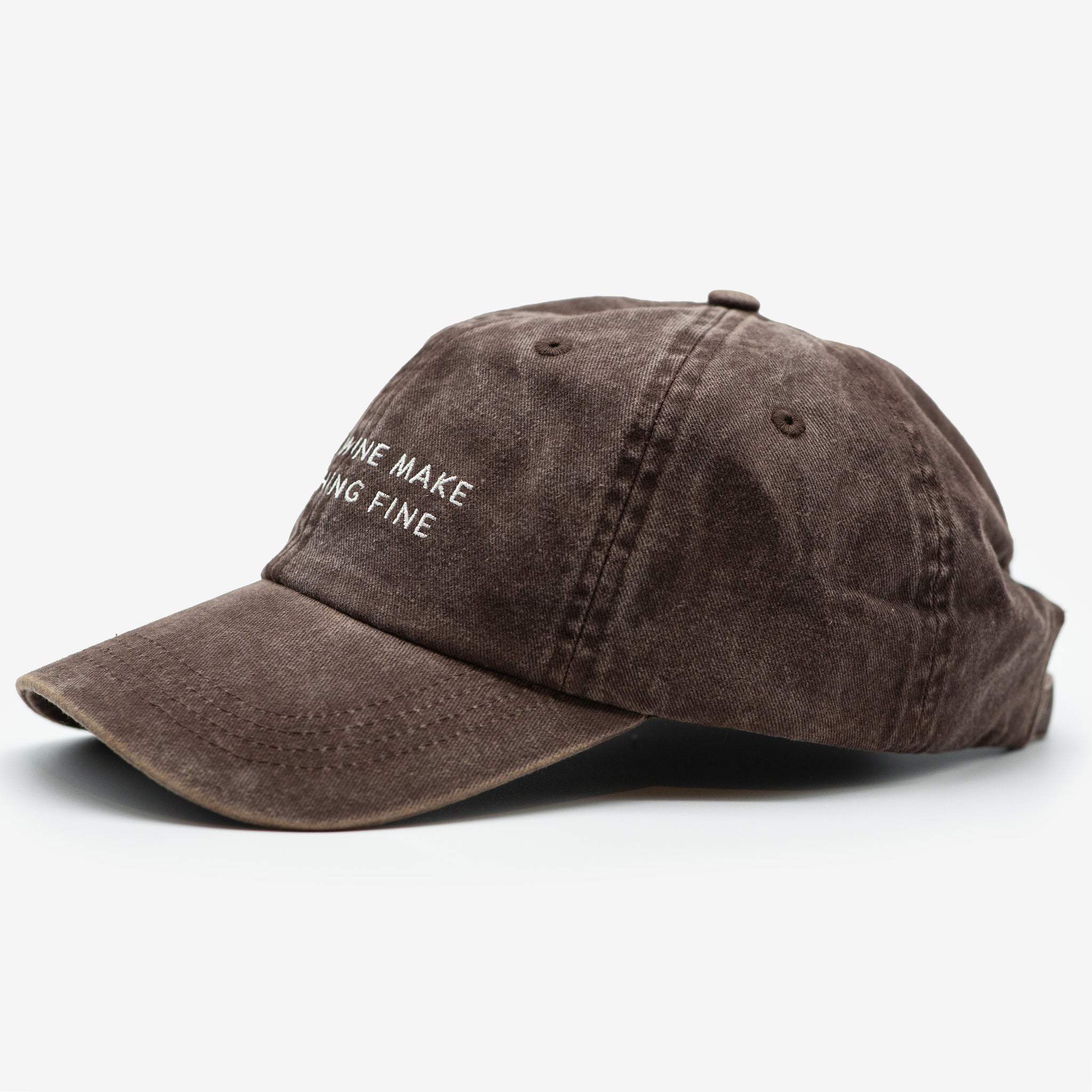 Unleash your playful side with this Brown Denim Cap. Featuring a quirky design of "Dogs & Wine Make Everything Fine", this cap is perfect for dog lovers and wine enthusiasts alike. Stay stylish and have some fun with this cap, because life's too short to take yourself too seriously.